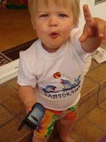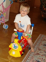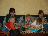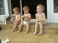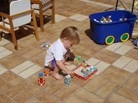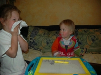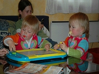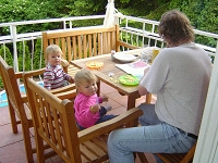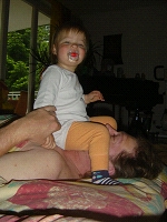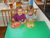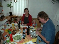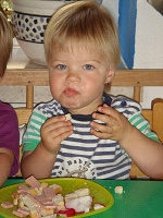 Zu Besuch: erstens VIEL essen, zweitens spielen und drittens mit der Katze schmusen! (Leider paßt das Bildformat nicht ganz, was ich aber erst beim "Texten" gemerkt habe. Aber: das bleibt jetzt einmal so, sonst dauert es NOCH länger, bis die Fotos online kommen)
