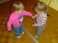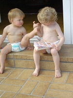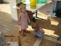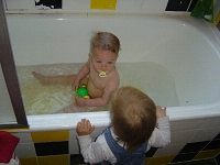 Ein Foto mit Seltenheitswert: Julia sitzt in der Badewanne und LACHT, hat SPASS und SPIELT!!!!!!!! Verena dagegen ist lieber draußen und beobachtet kopfschüttelnd, ob denn Julia noch normal ist...